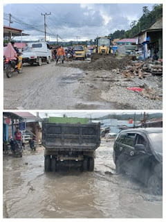 "Coba bapak lihat, petugas PU sedang membersihkan tumpukan pasir dan batu di tengah jalan akibat terbawa arus air yang Minggu lalu hujan selama 3 hari 2 malam," katanya," kata Daeng Rahman sambil menunjukkan jari.